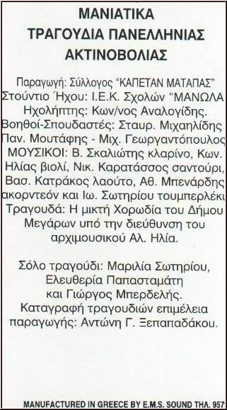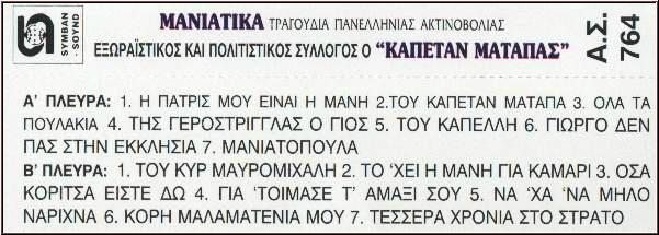 Την καλογραμμένη κασέτα εκυκλοφόρησε ο Μανιάτικος Σύλλογος των χωριών της Μέσα Μάνης, Χαριάς και Καλού (δίπλα στον Πύργο Διρού) «Ο Καπετάν Ματαπάς» (το όνομα του Συλλόγου προς τιμήν του Ήρωα Μακεδονομάχου Καπετάν Ματαπά - Μιχαήλ Αναγνωστάκου, ο οποίος σκοτώθηκε στη μάχη του Λαχανά το 1912). Να αναφέρουμε τα άλλα τεχνικά χαρακτηριστικά της παραγωγής αυτής.
