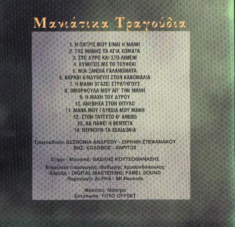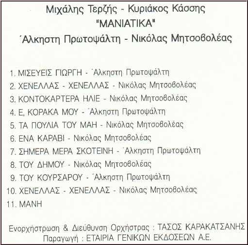 ΠΛΕΥΡΑ Β': 1. Του Κυρ Μαυρομιχάλη 2. Το 'χει η Μάνη για καμάρι 3. Όσα κορίτσα είστε δω 4. Για 'τοίμασε τ' αμάξι σου 5. Να 'χα 'να μήλο νάριχνα 6. Κόρη μαλαματένια μου 7. Τέσσερα χρόνια στο στρατό. (Για το παρόν κείμενο χρησιμοποιήθηκαν και πληροφορίες από το βιβλίο - θησαυρό: «Οδηγός Ελληνικής Δισκογραφίας" του συμπατριώτη μας, μαθηματικού Πέτρου Δραγουμάνου - Εκδόσεις Λιβάνη, "Νέα Σύνορα», σελ. 720).