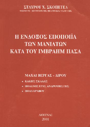 Νέα βιβλία για τη Μάνη: - Γεωργίου Η. Βενιζελέα «ΜΑΝΗ, Ταξιδιωτικός και Πολιτιστικός Οδηγός», εκδόσεις ΑΔΟΥΛΩΤΗ ΜΑΝΗ, 2003. - Αντώνη Ξεπαπαδάκου «590 Μανιάτικα Παραδοσιακά – Δημοτικά Τραγούδια». Η συλλογή συνοδεύεται και από σχετική κασέτα ήχου. - Βασιλείου Πιερρακέα «Οι παλαιοί Μανιάτες» (Λαογραφική μελέτη). - Νίκου Βασιλάτου «Οι Πύργοι της Μάνης - Φρουροί από πέτρα», Κλασσικές Εκδόσεις, Αθήνα 2001. - Σταύρου Σκοπετέα «Η Ένδοξος Εποποιΐα των Μανιατών κατά του Ιμβραήμ Πασά», Αθήνα 2001. - Β. Τσιμπιδάρου: «Μανιάτικες Αναμνήσεις», Ιωλκός» 2001 (Α' έκδοση 1989). - Στ. Πατρικουνάκου: «Ιστορία του Γυμνασίου και Λυκείου Αρεοπόλεως – Η Μάνη κατά τον εικοστό αιώνα», Αθήνα 2001. - Δ. Χιουρέα: «Η ζωή στην Καλαμάτα και την περιοχή της (η ελληνική επαρχία)»,Αθήνα 2001 - Περ. Ν. Στυλιανόπουλου: «Ιστορία της Μεσσηνίας (στο πλαίσιο της συνολικής ελληνικής ιστορίας)», Ελεύθερη Σκέψις 1999 (α’ έκδοση 1954) - Δ. Χρ. Δουκάκη: «Μεσσηνιακά και ιδιαίτερα περί Φαρών και Καλαμάτας (από των αρχαιοτάτων χρόνων μέχρι τον Καποδίστρια)», Ελεύθερη Σκέψις 1999 (α’ έκδοση 1905) - Κ. Βουγιουκλάκη: «Οι πρωτοπόροι του αγώνα – Η εθνική αντίσταση στη Λακωνία», Τροχαλία 2000 - Αρ. Καμαρινός: «Ο εμφύλιος πόλεμος στην Πελοπόννησο 1946-49», Σύγχρονη Εποχή 2000 - Ανδρέα Παγώνη: «GREEK HEROES –before and during the war of Independence – Zaharias, Nikolopoulos, Barbitsiotis», U.S.A. 2001.