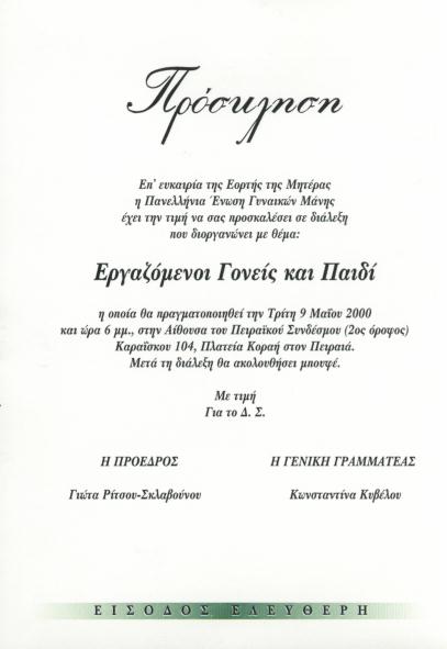 ΦΕΒΡΟΥΑΡΙΟΣ: Επαφές με διακεκριμένες γυναίκες από τον Πολιτικό και Ακαδημαϊκό χώρο για την εκδήλωση στις 3.3.2000. ΜΑΡΤΙΟΣ: (3.3.2000) Εκδήλωση για τον εορτασμό της ΠΑΓΚΟΣΜΙΑΣ ΗΜΕΡΑΣ ΤΗΣ ΓΥΝΑΙΚΑΣ & ΤΗΝ ΑΝΑΚΗΡΥΞΗ ΕΠΙΤΙΜΩΝ ΜΕΛΩΝ. Επίτιμα Μέλη ανακηρύχθησαν οι κ.κ. Μπεσμπέα Ελένη, Μαρίνα Οικονόμου -Λαλιώτη, Γεωργία Ξανθάκη - Καραμάνου και Μαρία Μαντουβάλου. ΑΠΡΙΛΙΟΣ: Επαφές με Εισηγητές (Ακαδημαϊκούς, Ψυχολόγους, Κοινωνιολόγους, Περιβαλλοντολόγους κ.α.), για την Εορτή της Μητέρας. ΜΑΙΟΣ: (9.5-2000)- Αίθουσα Πειραϊκού Συνδέσμου- Εκδήλωση για την ΕΟΡΤΗ ΤΗΣ ΜΗΤΕΡΑΣ - Δύο Ενότητες, οκτώ εισηγητές.